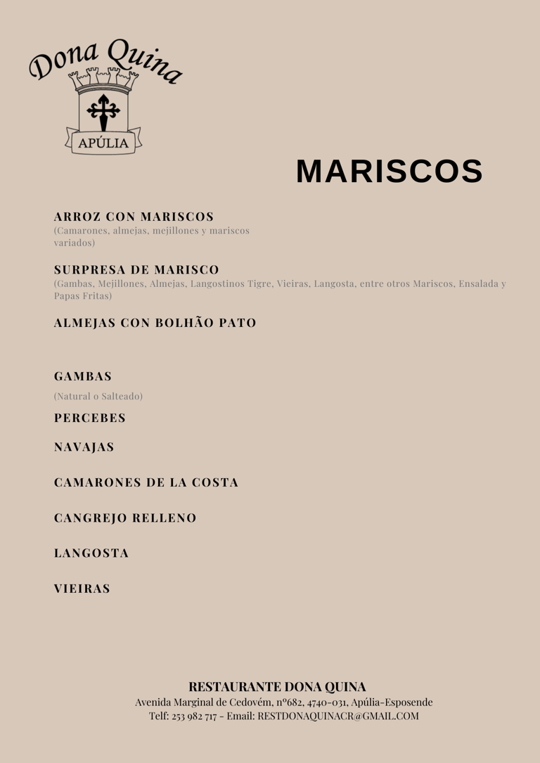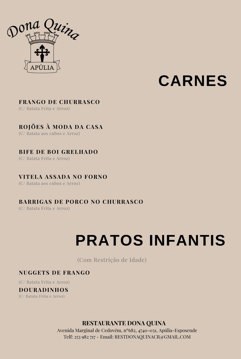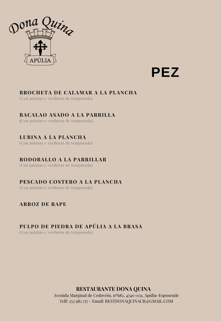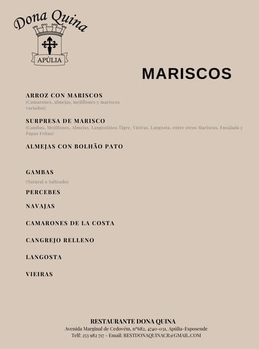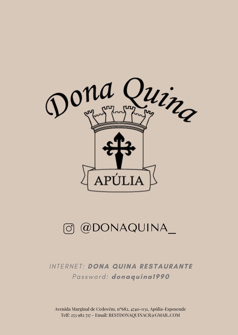 En Doña Quina la tradición está en el plato! Disfrute del sabor de los platos caseros, con pescado fresco, marisco de la costa y carnes asadas con mimo. Cada comida está elaborada con ingredientes de calidad, en un ambiente acogedor, perfecto para disfrutar de lo mejor de la cocina portuguesa.