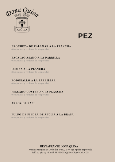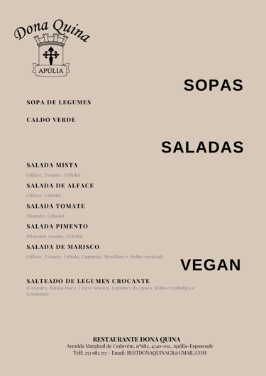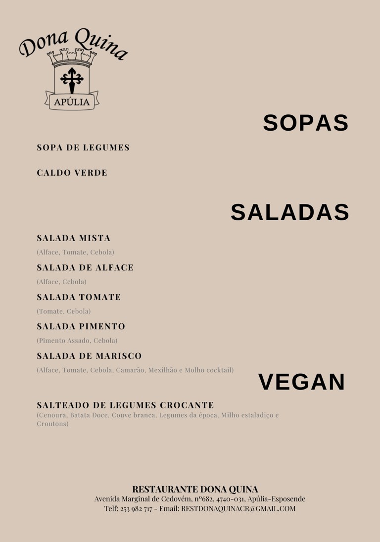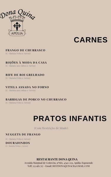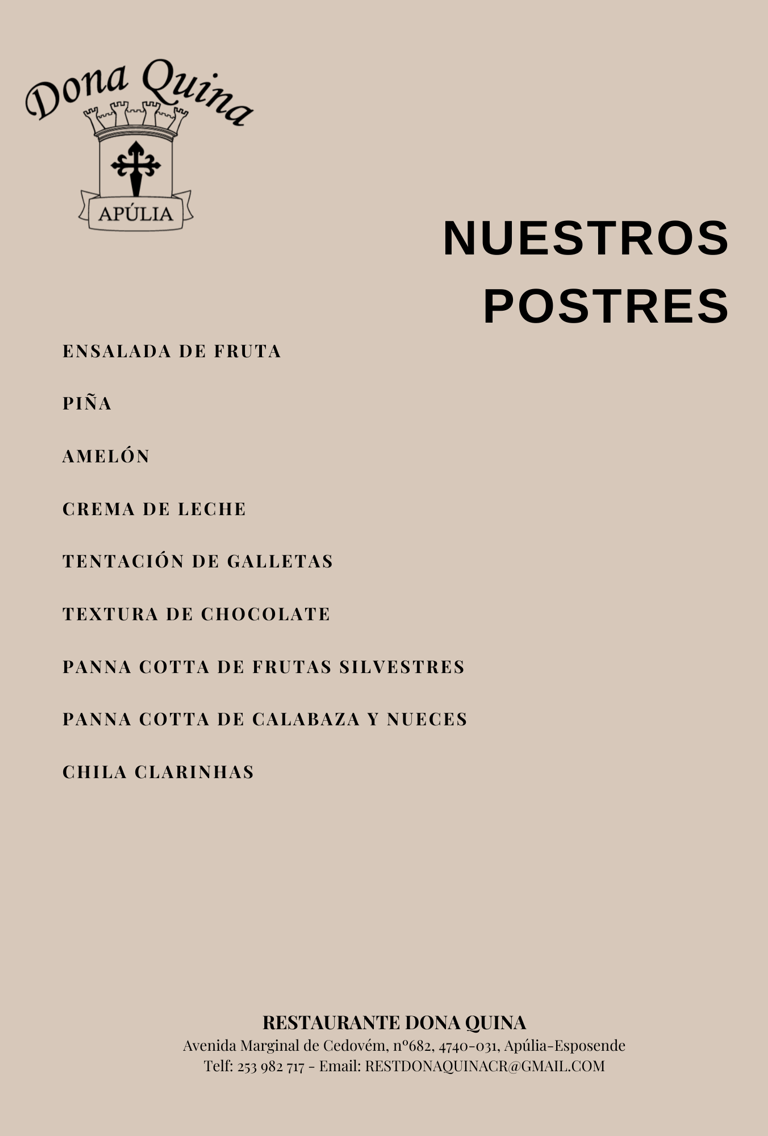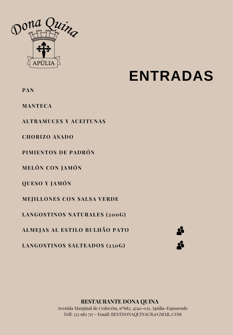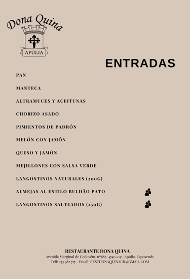 En Doña Quina la tradición está en el plato! Disfrute del sabor de los platos caseros, con pescado fresco, marisco de la costa y carnes asadas con mimo. Cada comida está elaborada con ingredientes de calidad, en un ambiente acogedor, perfecto para disfrutar de lo mejor de la cocina portuguesa.