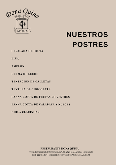 En Restaurante Doña Quina ofrecemos lo mejor de la cocina tradicional portuguesa, con platos caseros elaborados con mimo y con ingredientes frescos. Ya sea que quieras disfrutar de nuestras especialidades en el restaurante o en la comodidad de tu hogar, ¡tenemos la opción perfecta para ti!