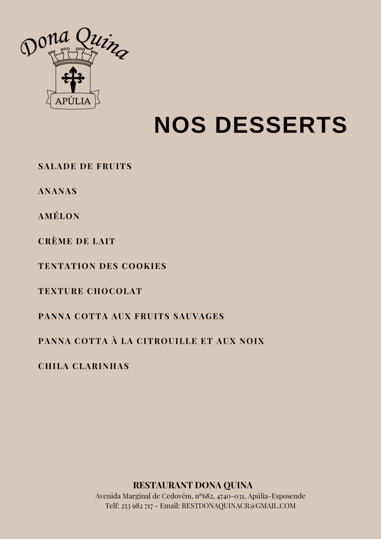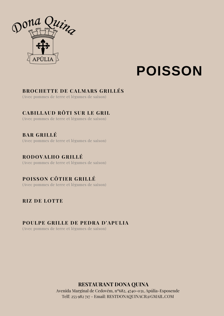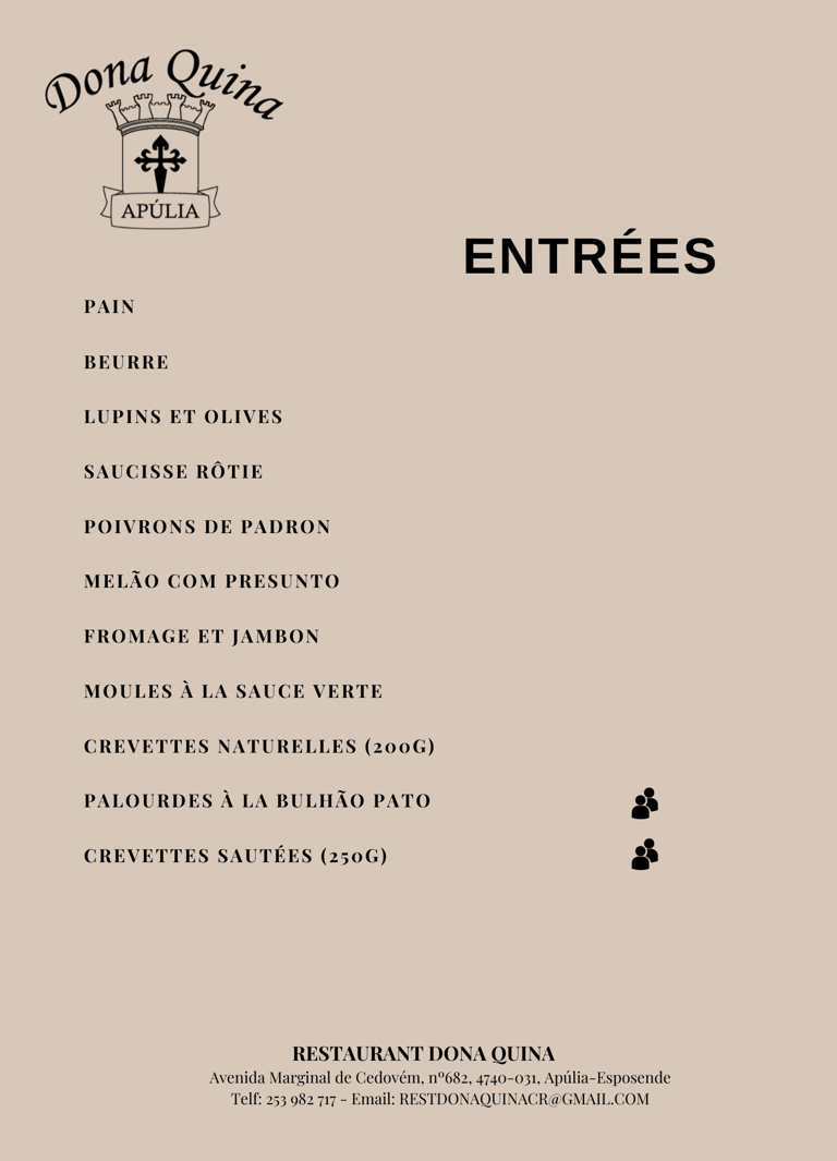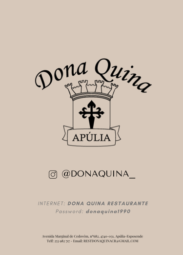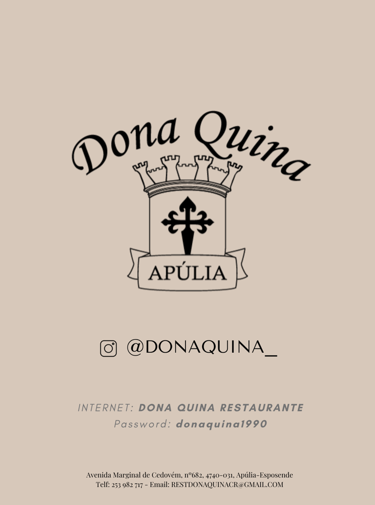 Chez Dona Quina, la tradition est dans l'assiette ! Savourez le goût des plats faits maison, avec du poisson frais, des fruits de mer de la côte et des viandes grillées avec soin. Chaque repas est préparé avec des ingrédients de qualité, dans un environnement accueillant, parfait pour savourer le meilleur de la cuisine portugaise.
