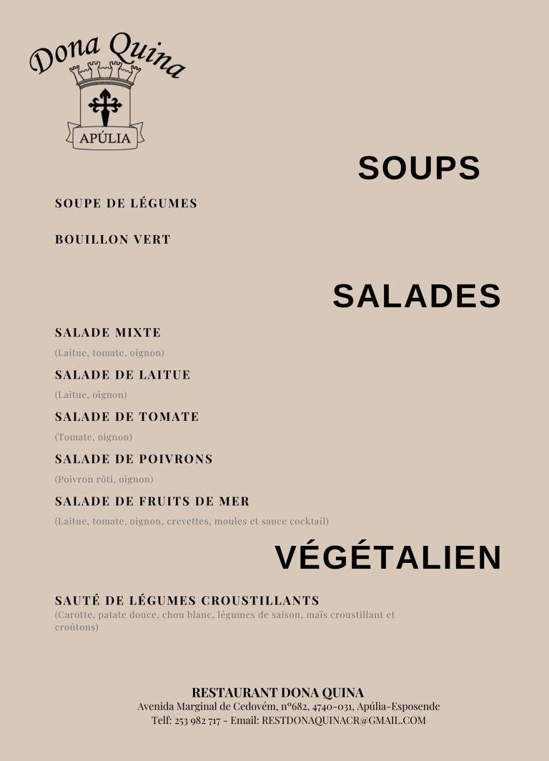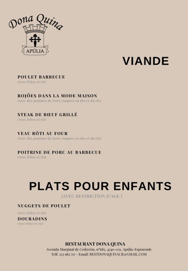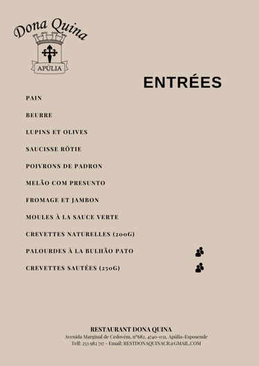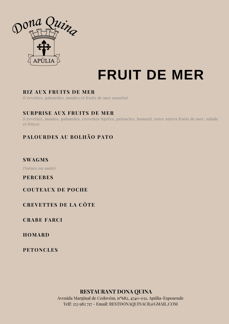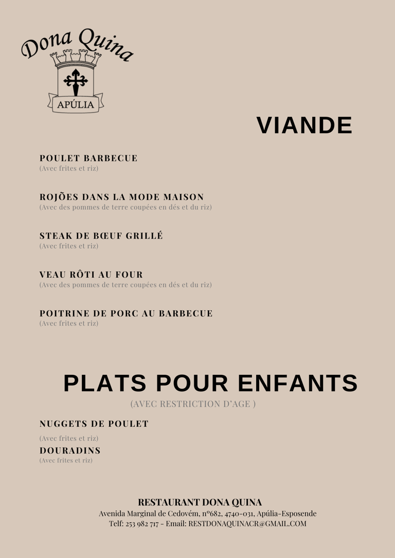 Chez Dona Quina, la tradition est dans l'assiette ! Savourez le goût des plats faits maison, avec du poisson frais, des fruits de mer de la côte et des viandes grillées avec soin. Chaque repas est préparé avec des ingrédients de qualité, dans un environnement accueillant, parfait pour savourer le meilleur de la cuisine portugaise.