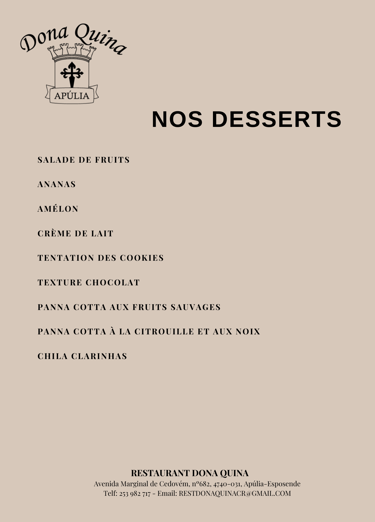 Au restaurant Dona Quina, nous vous proposons le meilleur de la cuisine traditionnelle portugaise, avec des plats faits maison avec soin et des ingrédients frais. Que vous souhaitiez déguster nos spécialités au restaurant ou dans le confort de votre foyer, nous avons l'option parfaite pour vous !